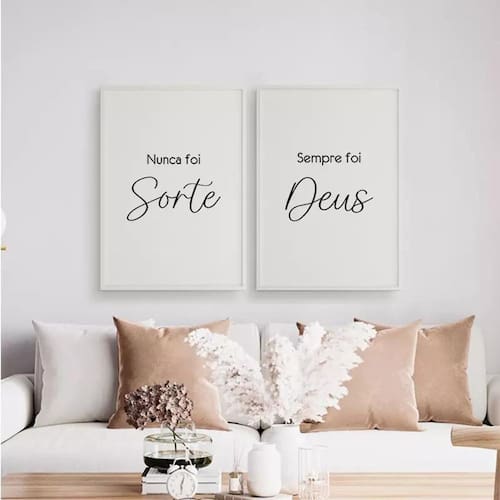 Kit 2 quadros nunca foi sorte sempre foi deus 33x24cm Moldura: madeira branca Informações do produto decoração para quarto, sala, cozinha, escritório, área gourmet e muito mais. Chega de paredes vazias Medidas - cada peça tem 33x24cm a4 . Material do papel - papel fotográfico brilhante de altíssima resolução Acabamento - todos os quadros são acompanhados de uma película de acetato para proteção da imagem. - os quadros são embalados de forma segura com plástico bolha com camada dupla de acordo com o tamanho dos quadros. - de 3 meses. Meu quadro chegou. Como posso fixá-lo Você precisa apenas de um martelo e um prego, pois os quadros já vão acompanhados de penduradores. Esta é a forma mais indicada. Caso prefira, você pode utilizar uma fita dupla face neste caso, sugerimos de alta qualidade para evitar que descole e seu quadro caia . Como posso limpar meu quadro A limpeza é feita como um móvel comum da sua casa. Apenas um pano seco ou espanador são suficientes para tal Ean: 7892932563493