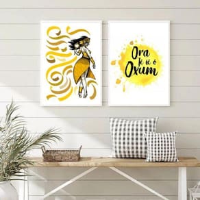 Kit 2 quadros orixá oxum - saudação 24x18cm Moldura: madeira preta Informações do produto tire todas as suas dúvidas no descritivo abaixo: decoração para quarto, sala, cozinha, escritório, área gourmet e muito mais. Chega de paredes vazias medidas - cada peça tem 24x18cm a5 . Material do papel - papel fotográfico brilhante de altíssima resolução acabamento - todos os quadros são acompanhados de uma película de acetato para proteção da imagem. - os quadros são embalados de forma segura com plástico bolha com camada dupla de acordo com o tamanho dos quadros. Garantia - garantia de 3 meses. Meu quadro chegou. Como posso fixá-lo Você precisa apenas de um martelo e um prego, pois os quadros já vão acompanhados de penduradores. Esta é a forma mais indicada. Caso prefira, você pode utilizar uma fita dupla face neste caso, sugerimos de alta qualidade para evitar que descole e seu quadro caia . Como posso limpar meu quadro A limpeza é feita como um móvel comum da sua casa. Apenas um pano seco ou espanador são suficientes para tal