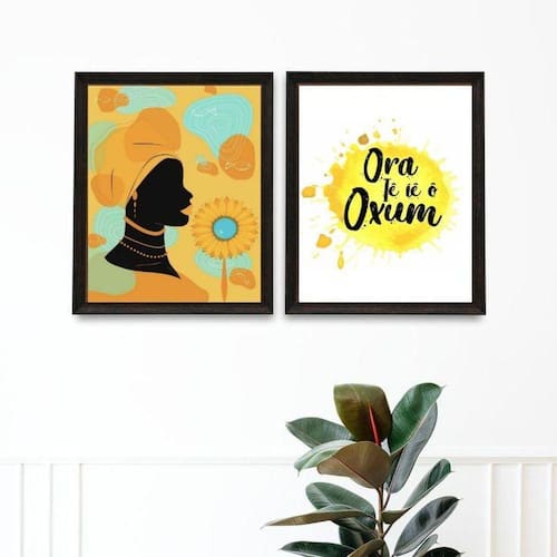 Kit 2 quadros oxum - saudação 45x34cm Moldura: madeira branca Informações do produto tire todas as suas dúvidas no descritivo abaixo: decoração para quarto, sala, cozinha, escritório, área gourmet e muito mais. Chega de paredes vazias. Medidas - cada peça tem 45x34cm a3 . Material do papel - papel fotográfico brilhante de altíssima resolução acabamento - todos os quadros são acompanhados de uma película de acetato para proteção da imagem. - os quadros são embalados de forma segura com plástico bolha com camada dupla de acordo com o tamanho dos quadros. Garantia - garantia de 3 meses. Meu quadro chegou. Como posso fixá-lo Você precisa apenas de um martelo e um prego, pois os quadros já vão acompanhados de penduradores. Esta é a forma mais indicada. Caso prefira, você pode utilizar uma fita dupla face neste caso, sugerimos de alta qualidade para evitar que descole e seu quadro caia . Como posso limpar meu quadro A limpeza é feita como um móvel comum da sua casa. Apenas um pano seco ou espanador são suficientes para tal
