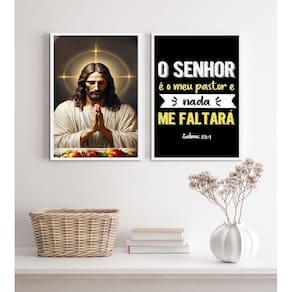 Kit 2 quadros para cozinha o senhor é meu pastor 33x24cm Moldura: madeira branca Informações do produto tire todas as suas dúvidas no descritivo abaixo: decoração para quarto, sala, cozinha, escritório, área gourmet e muito mais. Chega de paredes vazias medidas - cada peça tem 33x24cm a4 . Material do papel - papel fotográfico brilhante de altíssima resolução acabamento - todos os quadros são acompanhados de uma película de acetato para proteção da imagem. - os quadros são embalados de forma segura com plástico bolha com camada dupla de acordo com o tamanho dos quadros. Garantia - garantia de 3 meses. Meu quadro chegou. Como posso fixá-lo Você precisa apenas de um martelo e um prego, pois os quadros já vão acompanhados de penduradores. Esta é a forma mais indicada. Caso prefira, você pode utilizar uma fita dupla face neste caso, sugerimos de alta qualidade para evitar que descole e seu quadro caia . Como posso limpar meu quadro A limpeza é feita como um móvel comum da sua casa. Apenas um pano seco ou espanador são suficientes para tal Ean: 7899726839529