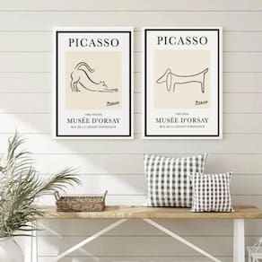 Kit 2 quadros picasso - gato e cachorro 24x18cm Moldura: madeira branca Informações do produto tire todas as suas dúvidas no descritivo abaixo: decoração para quarto, sala, cozinha, escritório, área gourmet e muito mais. Chega de paredes vazias medidas - cada peça tem 24x18cm a5 . Material do papel - papel fotográfico brilhante de altíssima resolução acabamento - todos os quadros são acompanhados de uma película de acetato para proteção da imagem. - os quadros são embalados de forma segura com plástico bolha com camada dupla de acordo com o tamanho dos quadros. Garantia - garantia de 3 meses. Meu quadro chegou. Como posso fixá-lo Você precisa apenas de um martelo e um prego, pois os quadros já vão acompanhados de penduradores. Esta é a forma mais indicada. Caso prefira, você pode utilizar uma fita dupla face neste caso, sugerimos de alta qualidade para evitar que descole e seu quadro caia . Como posso limpar meu quadro A limpeza é feita como um móvel comum da sua casa. Apenas um pano seco ou espanador são suficientes para tal