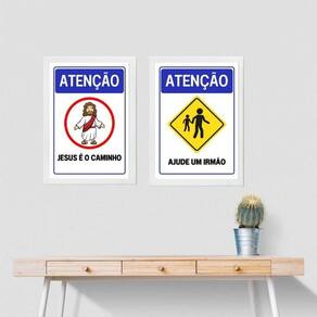 Kit 2 quadros placas cristãs - atenção 24x18cm Moldura: madeira branca Informações do produto tire todas as suas dúvidas no descritivo abaixo: decoração para quarto, sala, cozinha, escritório, área gourmet e muito mais. Chega de paredes vazias medidas - cada peça tem 24x18cm a5 . Material do papel - papel fotográfico brilhante de altíssima resolução acabamento - todos os quadros são acompanhados de uma película de acetato para proteção da imagem. - os quadros são embalados de forma segura com plástico bolha com camada dupla de acordo com o tamanho dos quadros. Garantia - garantia de 3 meses. Meu quadro chegou. Como posso fixá-lo Você precisa apenas de um martelo e um prego, pois os quadros já vão acompanhados de penduradores. Esta é a forma mais indicada. Caso prefira, você pode utilizar uma fita dupla face neste caso, sugerimos de alta qualidade para evitar que descole e seu quadro caia . Como posso limpar meu quadro A limpeza é feita como um móvel comum da sua casa. Apenas um pano seco ou espanador são suficientes para tal