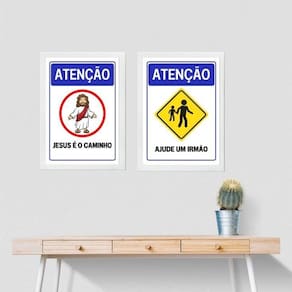 Kit 2 quadros placas cristãs - atenção 45x34cm Moldura: madeira branca Informações do produto tire todas as suas dúvidas no descritivo abaixo: decoração para quarto, sala, cozinha, escritório, área gourmet e muito mais. Chega de paredes vazias. Medidas - cada peça tem 45x34cm a3 . Material do papel - papel fotográfico brilhante de altíssima resolução acabamento - todos os quadros são acompanhados de uma película de acetato para proteção da imagem. - os quadros são embalados de forma segura com plástico bolha com camada dupla de acordo com o tamanho dos quadros. Garantia - garantia de 3 meses. Meu quadro chegou. Como posso fixá-lo Você precisa apenas de um martelo e um prego, pois os quadros já vão acompanhados de penduradores. Esta é a forma mais indicada. Caso prefira, você pode utilizar uma fita dupla face neste caso, sugerimos de alta qualidade para evitar que descole e seu quadro caia . Como posso limpar meu quadro A limpeza é feita como um móvel comum da sua casa. Apenas um pano seco ou espanador são suficientes para tal