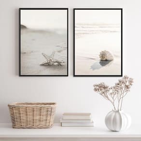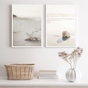 Kit 2 quadros praia branco e bege- concha e estrela 45x34cm - com vidro
