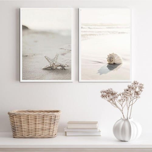 Kit 2 Quadros Praia Branco E Bege- Concha E Estrela 45X34Cm