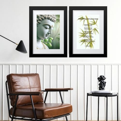 Kit 2 quadros princípios do reiki - 60x48cm Moldura: madeira preta Informações do produto tire todas as suas dúvidas no descritivo abaixo: decoração para quarto, sala, cozinha, escritório, área gourmet e muito mais. Chega de paredes vazias medidas - cada peça tem 60x48cm . Material do papel - papel fotográfico brilhante de altíssima resolução acabamento - todos os quadros são acompanhados de vidro para proteção da imagem. - moldura em madeira maciça na cor preta e pendurador. - paspatur branco com 7cm de largura - os quadros são embalados de forma segura com plástico bolha com camada dupla de acordo com o tamanho dos quadros. Garantia - garantia de 3 meses. Meu quadro chegou. Como posso fixá-lo Você precisa apenas de um martelo e um prego, pois os quadros já vão acompanhados de penduradores. Esta é a forma mais indicada. Como posso limpar meu quadro A limpeza é feita como um móvel comum da sua casa. Apenas um pano seco ou espanador são suficientes para tal Cor: moldura preta