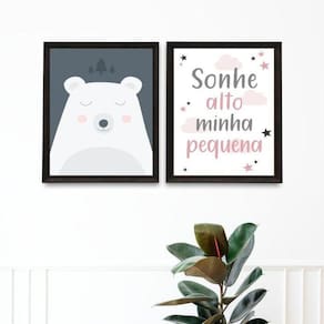 Kit 2 quadros quarto bebê urso rosa e cinza 45x34cm - com vidro Moldura: madeira branca Informações do produto tire todas as suas dúvidas no descritivo abaixo: decoração para quarto, sala, cozinha, escritório, área gourmet e muito mais. Chega de paredes vazias medidas - cada peça tem 45x34cm a3 . Material do papel - papel fotográfico brilhante de altíssima resolução acabamento - todos os quadros são acompanhados de vidro para proteção da imagem. - moldura em madeira maciça na cor preta ou branca conforme produto escolhido e pendurador . - os quadros são embalados de forma segura com plástico bolha com camada dupla de acordo com o tamanho dos quadros. Garantia - garantia de 3 meses. Meu quadro chegou. Como posso fixá-lo Você precisa apenas de um martelo e um prego, pois os quadros já vão acompanhados de penduradores. Esta é a forma mais indicada. Como posso limpar meu quadro A limpeza é feita como um móvel comum da sua casa. Apenas um pano seco ou espanador são suficientes para tal