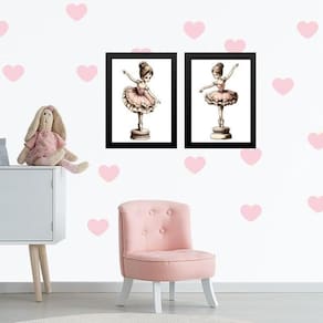 Kit 2 quadros quarto menina bailarina caixinha música 24x18cm - com vidro Moldura: madeira preta Informações do produto tire todas as suas dúvidas no descritivo abaixo: decoração para quarto, sala, cozinha, escritório, área gourmet e muito mais. Chega de paredes vazias medidas - cada peça tem 24x18cm a5 . Material do papel - papel fotográfico brilhante de altíssima resolução acabamento - todos os quadros são acompanhados de vidro para proteção da imagem. - moldura em madeira maciça na cor preta ou branca conforme produto escolhido e pendurador . - os quadros são embalados de forma segura com plástico bolha com camada dupla de acordo com o tamanho dos quadros. Garantia - garantia de 3 meses. Meu quadro chegou. Como posso fixá-lo Você precisa apenas de um martelo e um prego, pois os quadros já vão acompanhados de penduradores. Esta é a forma mais indicada. Como posso limpar meu quadro A limpeza é feita como um móvel comum da sua casa. Apenas um pano seco ou espanador são suficientes para tal