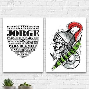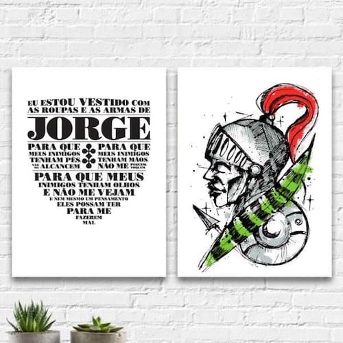 O Kit 2 Quadros São Jorge Espada Oração 45X34Cm - Com Vidro é perfeito para decorar qualquer ambiente da sua casa. Com moldura de madeira preta, esses quadros são ideais para quartos, salas, cozinhas, escritórios, áreas gourmet e muito mais. Cada peça do kit possui as medidas de 45x34cm A3 e é feita de papel fotográfico brilhante de altíssima resolução. Além disso, todos os quadros são acompanhados de vidro para proteção da imagem. A moldura em madeira maciça na cor preta dá um toque de elegância e sofisticação aos quadros, que também vêm com penduradores para facilitar a fixação. A limpeza dos quadros é simples e fácil, basta utilizar um pano seco ou espanador, assim como você faria com qualquer móvel da sua casa. Com de 3 meses, os quadros são embalados de forma segura com plástico bolha com camada dupla de acordo com o tamanho dos quadros, garantindo que eles cheguem em perfeito estado até você. Agora você pode dar vida às suas paredes vazias com o Kit 2 Quadros São Jorge Espada Oração 45X34Cm - Com Vidro. Não perca tempo e adquira já o seu! Especificações técnicas: - Título: Kit 2 Quadros São Jorge Espada Oração 45X34Cm - Com Vidro - Descrição: Kit com 2 quadros com a imagem de São Jorge com espada e oração - Moldura: Madeira preta - Material do papel: Papel fotográfico brilhante de altíssima resolução - Medidas: Cada peça tem 45x34cm A3 - Acompanha vidro para proteção da imagem - Moldura em madeira maciça na cor preta - Penduradores inclusos para facilitar a fixação - Embalagem segura com plástico bolha com camada dupla - : 3 meses Perguntas frequentes: 1. Como posso fixar meu quadro? R: Os quadros já vão acompanhados de penduradores, basta utilizar um martelo e um prego para fixá-los na parede. 2. Como posso limpar meu quadro? R: A limpeza é simples, basta utilizar um pano seco ou espanador, assim como você faria com qualquer móvel da sua casa. Deixe sua casa mais bonita e cheia de personalidade com o Kit 2 Quadros São Jorge Espada Oração 45X34Cm - Com Vidro. Aproveite essa oportunidade e adquira já o seu! Ean: 7891438411604