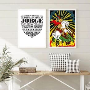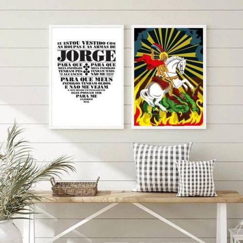 O Kit 2 Quadros São Jorge Guerreiro Oração é perfeito para decorar diversos ambientes da sua casa. Com medidas de 33x24cm A4 , cada quadro é produzido com material de alta qualidade e possui uma moldura de madeira branca, que traz um toque de elegância à decoração.