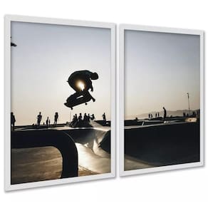 Kit 2 quadros skatista manobra aérea pista 33x24cm - com vidro Cor: moldura branca Informações do produto tire todas as suas dúvidas no descritivo abaixo: decoração para quarto, sala, cozinha, escritório, área gourmet e muito mais. Chega de paredes vazias medidas - cada peça tem 33x24cm a4 . Material do papel - papel fotográfico brilhante de altíssima resolução acabamento - todos os quadros são acompanhados de vidro para proteção da imagem. - moldura em madeira maciça na cor preta ou branca conforme produto escolhido e pendurador . - os quadros são embalados de forma segura com plástico bolha com camada dupla de acordo com o tamanho dos quadros. - de 3 meses. Meu quadro chegou. Como posso fixá-lo Você precisa apenas de um martelo e um prego, pois os quadros já vão acompanhados de penduradores. Esta é a forma mais indicada. Como posso limpar meu quadro A limpeza é feita como um móvel comum da sua casa. Apenas um pano seco ou espanador são suficientes para tal