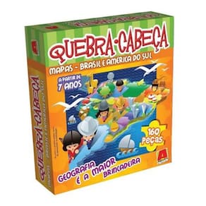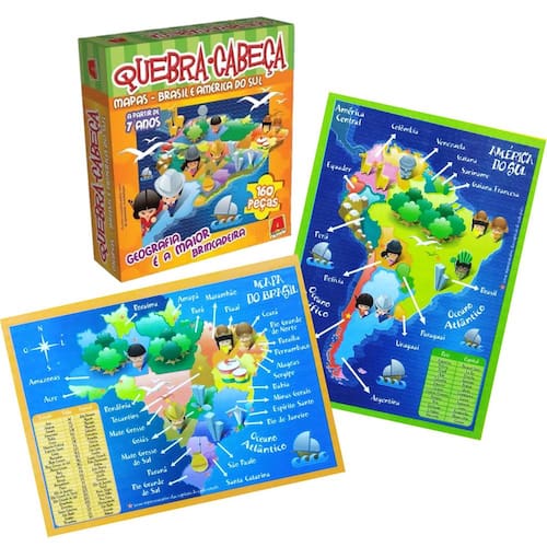 Kit com 2 quebra cabeças com tema de mapas: Brasil e América do Sul. Indicado para criança acima de 7 anos Tamanho montado: 23 x 32 cm cada Peças: 80 peças cada, total 120 Material: papel cartão. Inmetro: CE-BRI/BRICS 00032-14 NM 300/2002 OCP 0098 Referência: 3.03.435 Ean: 7897447203131