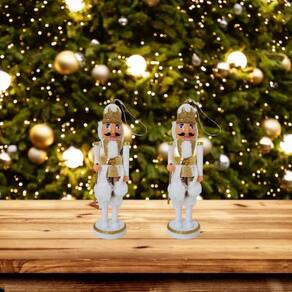 Este Quebra-Nozes decorado em branco e dourado é a peça de luxo que vai elevar sua decoração natalina. Com 28cm de altura, ele é adornado com um bastão com uma estrela dourada brilhante e um chapéu macio em pelúcia, que trazem sofisticação e charme. Além de sua beleza, esse Quebra-Nozes conta com um braço esquerdo articulado e uma boca funcional, acionada por uma alavanca em plástico, tornando-o não apenas decorativo, mas também interativo. Ideal para decorar entradas, mesas ou prateleiras, essa peça é perfeita para quem busca elegância e tradição com um toque de diversão.