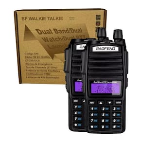 Kit 2 radio comunicador walktalk talkabout uv82 Rádio comunicador ideal para profissionais que necessitam de comunicação rápida durante o dia, com a praticidade de apertar apenas um botão. Possui alta qualidade nas comunicações a longa distância. Com diferentes profundidades de sinal, haverá diversos canais disponíveis, proporcionando um som claro e sem interferência Características: - vhf/ uhf/ fm - transmissor dual-band - display lcd - função vox - memória para 128 canais - função bipe no teclado - função alarme - lanterna embutida - modo scan - programável pelo computador - bateria de lítio de alta capacidade - rádio fm - modo economia de bateria - codificado em dtmf Informações técnicas: - produto: rádio comunicador baofeng - modelo: uv-82 - cor: preto - memória: 128 canais - alcance: até 12 km em campo aberto - potência de saída: 5w - voltagem: dc 7.4v - bateria interna de lítion 2800mah - modelo da bateria: bl-8 - duração da bateria: cerca de 12 horas - tempo de carregamento: aproximadamente 5 horas - temperatura de operação: -20c60c - consumo: 380mah - estabilidade de frequência: 2.5 ppm - impedância da antena: 50 ohm - modo de operação: simples ou semi-duplo - range de frequência: 65mhz108mhz recepção rádio fm - frequência: Vhf: 136mhz - 174mhz Uhf: 400mhz- 520mhz - resposta especulativo: 60db - potência de saída de áudio: 1000mw Itens inclusos: - 2x rádios - 2x antenas - 2x baterias - 2x fones de ouvido - 2x fontes para carregamento - 2x bases - 2x manuais Marca: Não Informado