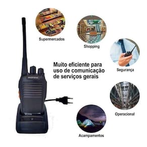 Rádio comunicador com 16 canais, alcance de até 12km, lanterna, função VOX, indicador de carga da bateria, conexão para fone de ouvido, bateria recarregável, bidirecional, portátil.Indicador de carga da bateria
