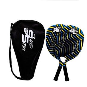 Kit com 2 raquetes Marca: Sand Spin Modelo: Aloha Cor Predominante: Azul Indicada para: Beach Tennis Tamanho do cabo: 12cm Tamanho total: 49cm Furos: 28 Tipo de EVA: Soft Densidade do E.V.A: 19 Soft Nível de habilidade: Iniciantes e Intermediário Material do frame e da face: Fibra de carbono