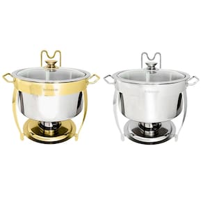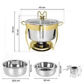 ESPECIFICAÇÕES TÉCNICAS: - Marca: BRINOVAR - Cor: Prata / Dourado - Formato: Redondo - Material: Aço Inoxidável 201 - Dimensões do Produto Montado: - Comprimento: 33 cm - Largura: 40 cm - Altura: 35 cm - Capacidade: 8 Litros - Quantidade de Cubas: 1 un - Recipiente para comida: 28cm Diametro x 13,5cm Altura - Recipiente para Água (Banho Maria): 29,5cm Diametro x 15,5cm Altura - Tipo de Acendedor: Fogareiro 9cm Comprimento x 6cm Altura - Quantidade de Acendedor: 1 un - Ambiente Recomendado: Buffet, Refeitório, Cozinha e Festas - Garantia: 90 dias