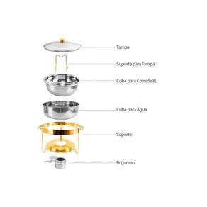 Kit 2un rechaud redondo banho maria dourado 8 litros O rechaud redondo 8 litros tem a estrutura e o fogareiro em aço inox altamente durável, resistente e fácil de limpar. Possui a tampa em vidro temperado, com saída de vapor. Vem com um prático apoio para tampa. A da cuba é muito simples, podendo ser realizada durante o uso do produto, sem prejudicar o serviço. Ideal para quem tem um estabelecimento, vai fazer um evento ou sempre gosta de receber um número maior de pessoas em casa. Especificações técnicas: Marca: brinovar Cor: dourado Formato: redondo Material: aço inoxidável 201 Dimensões do produto montado: Comprimento: 33 cm Largura: 40 cm Altura: 35 cm Capacidade: 8 litros Quantidade de cubas: 1 un Quantidade de acendedor: 1 un Recipiente para comida: 28cm diametro x 13,5cm altura Recipiente para água banho maria : 29,5cm diametro x 15,5cm altura Tipo de acendedor: fogareiro 9cm c x 6cm a Ambiente recomendado: buffet, refeitório, cozinha e festas : 90 dias Cuidados: Esta peça contém bordas cortantes, manusear com cuidado. Não use palha de aço, produtos químicos, não usar ácido muriático, água sanitária ou qualquer outro solvente para a limpeza. Enxaguar e secar bem a peça após o uso. Nunca deixar objetos metálicos sobre a peça por períodos muito longos, para evitar a corrosão. Para manter o brilho do seu rechaud, recomendamos o uso da pasta para polir e remover manchas em superfícies de aço inoxidável. Itens inclusos: 2 estrutura - 1 estrutura para cada rechaud 2 cubas para comida - 1 cuba de comida para cada rechaud 2 cubas para água banho maria - 1 cuba de agua para cada rechaud 2 tampas de vidro com respiro - 1 tampa de vidro com respiro para cada rechaud 2 fogareiros - 1 fogareiro para cada rechaud 2 suportes traseiro para tampa - 1 suporte para cada rechaud Marca: Não Informado Ean: 7909650468112
