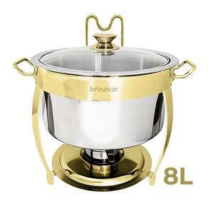 Kit 2 rechaud redondo banho maria aço inox 8 litros brinovar Rechaud redondo prata e dourado banho maria 8 litros cada O rechaud redondo 8 litros tem a estrutura e o fogareiro em aço inox altamente durável, resistente e fácil de limpar. Possui a tampa em vidro temperado, com saída de vapor. Vem com um prático apoio para tampa. A da cuba é muito simples, podendo ser realizada durante o uso do produto, sem prejudicar o serviço. Ideal para quem tem um estabelecimento, vai fazer um evento ou sempre gosta de receber um número maior de pessoas em casa. Especificações técnicas: - marca: brinovar - cor: prata / dourado - formato: redondo - material: aço inoxidável 201 - dimensões do produto montado: - comprimento: 33 cm - largura: 40 cm - altura: 35 cm - capacidade: 8 litros - quantidade de cubas: 1 un - recipiente para comida: 28cm diametro x 13,5cm altura - recipiente para água banho maria : 29,5cm diametro x 15,5cm altura - tipo de acendedor: fogareiro 9cm comprimento x 6cm altura - quantidade de acendedor: 1 un - ambiente recomendado: buffet, refeitório, cozinha e festas - : 90 dias Cuidados: - esta peça contém bordas cortantes, manusear com cuidado. - não use palha de aço, produtos químicos, não usar ácido muriático, água sanitária ou qualquer outro solvente para a limpeza. - enxaguar e secar bem a peça após o uso. - nunca deixar objetos metálicos sobre a peça por períodos muito longos, para evitar a corrosão. - para manter o brilho do seu rechaud, recomendamos o uso da pasta para polir e remover manchas em superfícies de aço inoxidável. Itens inclusos: - 2 estruturas - 1 para cada rechaud - 2 cubas para comida - 1 cuba de comida para cada réchaud - 2 cubas para água banho maria - 1 cuba de agua para cada réchaud - 2 tampas de vidro com respiro - 1 tampa para cada réchaud - 2 fogareiros - 1 fogareiro para cada réchaud - 2 suporte traseiro para tampa - 1 suporte traseiro para tampa para cada rechaud Marca: Não Informado