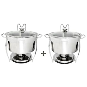 Medidas da Cuba de Comida: 28cm de Diâmetro por 14cm de Altura 8 Litros Medidas da Cuba de Água: 29,5cm de Diâmetro por 16cm de Altura Medidas do Rechaud Montado: 39cm de Largura por 35cm de Altura