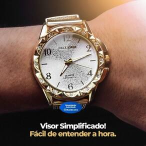 Especificações Técnicas: 1. Relógio Analógico Dourado: - Cor: Dourado - Prova D'água: Sim - Pulseira de Silicone Ajustável: Serve em qualquer tamanho de pulso - Material da Pulseira: Silicone 1. Relógio Analógico Rose: - Cor: Rose - Prova D'água: Sim - Pulseira de Silicone Ajustável: Serve em qualquer tamanho de pulso - Material da Pulseira: Silicone