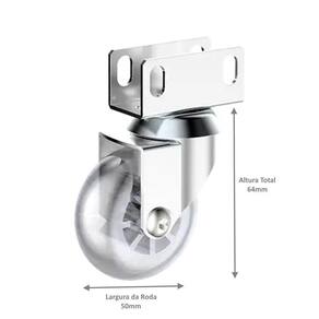 Rodizio de Gel Giratório Soprano possui acabamento cromado e rodas injetadas em policarbonato e revestidas em poliuretano transparente, resiste à corrosão, apresenta boa mobilidade e excelente acabamento estético. A versatilidade e flexibilidade proporcionam uma movimentação suave dos móveis. Sua estrutura em aço com base giratória rolamentada. Aplicação Rodízios para móveis como mesas, armários, camas, berços, puffs, baús e afins. e decoração, cargas leves e acessórios de utilidades para atacado e varejo. Especificações: - Antirruído - Chapa U 19mm - Diâmetro da roda: 50mm - Largura da roda: 20,5mm - Altura total: 64mm - Espessura do eixo da roda: 6mm - Raio de giro do rodízio: 52mm - Rolamento na roda: Não - Carga por rodízio: 40kg por rodizio Embalagem - 4 Rodizios de Gel Giratorio com freio - 2 Rodizios de Gel Giratorio sem freio Informações - Indicado somente para uso interno; - Evitar exposição à radiação ultravioleta; - Recomenda-se um espaçamento máximo de 70cm quando aplicado em chapas de madeira; - Recomenda-se lubrificação periódica das partes articuladas; undefined