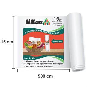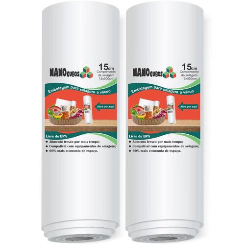 Kit 2 Rolos Nanocubos 15x500 Sacos Ranhura Seladora A Vácuo Embalagens 2 rolos NANOCUBOS 15 cm X 500 cm para seladoras a vácuo. Embalar produtos a vácuo é a melhor forma de mantê-los sempre protegidos por muito mais tempo. Ao embalar alimentos, a validade deles é completamente estendida, pois eles não terão nenhum contato com o ar e serão pouco afetados pela ação do tempo. Você pode embalar tanto alimentos crus como alimentos já preparados para serem consumidos em outro momento. Você economiza muito dinheiro e evita o desperdício Os sacos para vácuo Nanocubos são produzidos com alta tecnologia em Nylon Poli seguindo padrões de qualidade internacional. Possuem 12 micras, 3 barreiras de proteção, sem presença de BPA Não tóxicos e funcionam com equipamentos de embalagens a vácuo. Além de alimentos, é possível utilizá-lo com objetos pessoais, documentos ou utensílios, conservando-os como novos por muito tempo e aumentando sua vida útil.
