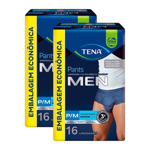 Roupa Íntima Descartável Tena Pants Men Tamanho P/M com 16 Unidades TENA Pants MEN é uma roupa íntima descartável que veste como cueca, desenvolvida especialmente para homens com incontinência dormida que buscam conforto, discrição, segurança contra calçados e manter o cuidado com a pele. Possui neutralizador de odor e uma zona de absorção segura, formato anatômico que se ajusta perfeitamente ao corpo proporcionando conforto, facilidade de uso e descrição. A segurança deve-se especialmente a uma zona de absorção frontal que absorve rapidamente a urina, mantendo-a longe da pele e assim, deixando-a seca, ajudando a reduzir o risco de irritações ou evitadas. TENA Pants MEN é ideal para homens ativos, discretos como uma cueca, com controle de odor e alta absorção. • Zona de absorção segura - Centro de absorção frontal para maior segurança contra vazamentos; • Masculino e Discreto - na cor azul marinho e modelagem masculina; • Neutralizador de odores - Para extra confiança; • Melhor ajuste - Material flexível, macio e respirável; • Toque extra suave - Material semelhante ao tecido que garante mais maciez ao produto, sem o ruído típico de plástico, proporcionando maior conforto; • Elásticos suaves em volta da cintura permitindo uma adaptação perfeita ao corpo; • Elásticos duplos nas pernas para um melhor conforto e segurança contra fugas; • Costuras laterais removíveis para retirar o produto com maior facilidade. Ean: 7896770982195