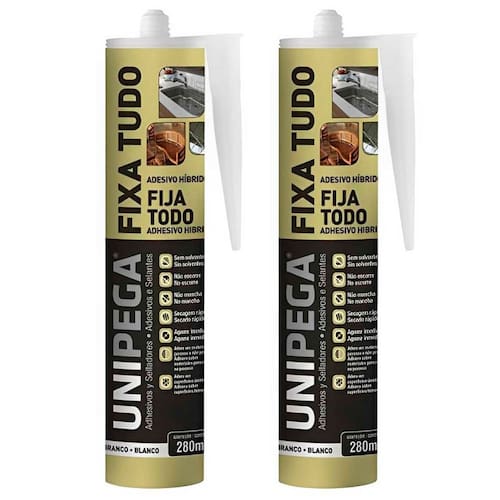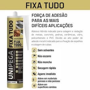 Ficha Técnica:Marca: Unipega Modelo: Branco Fixa Tudo Tipo: Adesivo Híbrido Monocomponente Cor: Branco Capacidade: 280ml cada unidade Indicado para: Metais, concreto, pedras, cerâmicas, vidro, policarbonato e PVC