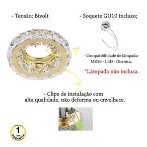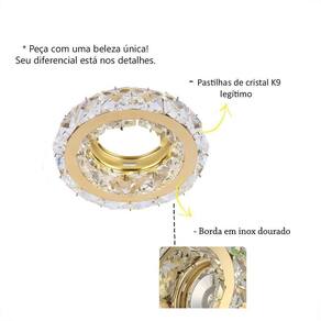 Kit 2 Spot De Cristal K9 Embutir Inox Dourado Redondo Mr16 Lup62 Spot de Embutir Redondo com Pastilhas de Cristal K9 Transparente e Inox na cor dourado. Neste kit contém: - 02 unidades do spot - Importante: Tamanho 9,5 cm de diâmetro. Tamanho do recorte no teto de 6 a 7 cm de diâmetro. Produto para Embutir em Gesso, Madeira ou PVC . Não serve para Laje. Descrição: - Material: Cristal Transparente e Metal Dourado - Dimensões: 9,5 cm diâmetro x H 2,5 cm altura - Tamanho do recorte no teto: 6 a 7 cm - Quantidade de Lâmpadas: 1 MR16 - Soquete: GU10 incluso - Potência Máxima: 50W - Tensão: Bivolt - : 1 ano - Compatibilidade: LED - MR16 - Dicróica Lâmpadas não inclusas. Marca: Não Informado Ean: 7794879799938