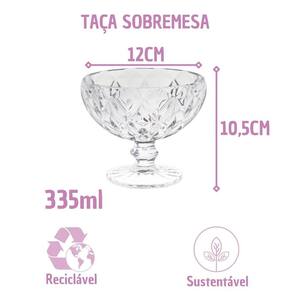 Taça de Sobremesa de 335ml Diamante Com sua capacidade de 335ml, essas taças são ideais para servir porções generosas de sobremesas como sorvetes, mousses, pudins e outras delícias. Além disso, por serem transparentes, permitem que você aprecie a beleza das camadas e texturas de suas sobremesas, tornando a experiência de saboreá-las ainda mais agradável. Estas taças são fáceis de limpar e podem ser utilizadas em diversas ocasiões, proporcionando um toque especial e elegante à sua mesa.
