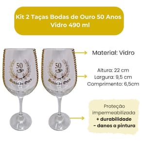 Kit 2 Taças Vidro Bodas de Ouro 50 Anos Luxo + Presente Adquira esta Taça maravilhosa e ganhe um lindo presente. Kit 2 Taças Vidro Bodas de Ouro 50 Anos Luxo Personalizada Vinho 490ml - Nadir Figueiredo - Barone