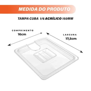 Material: Acrílico de alta resistência (Policarbonato) Dimensões: 17,5 cm x 16 cm (L x C) Compatibilidade: Compatível com Cuba Gastronômica GN 1/6 Diferencial: Recorte para encaixe de colher de acrílico Cor: Transparente Uso indicado: Restaurantes, buffets, sorveterias, açaíterias, cozinhas industriais e eventos
