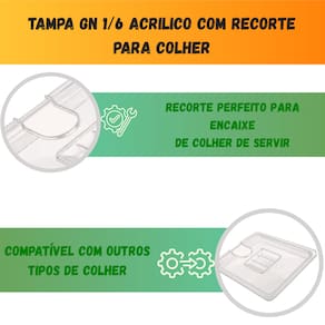 Fabricada em acrílico resistente (policarbonato), ela protege os alimentos contra contaminações, permite visualização rápida do conteúdo e ainda conta com recorte exclusivo, que possibilita deixar a colher de acrílico encaixada mesmo com a tampa colocada – perfeita para o serviço contínuo e ágil.