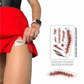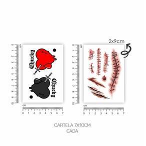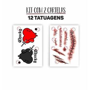 Kit 2 tatuagens temporárias coração chucky e cicatrizes Esse anúncio é correspondente a 2 cartelas como na imagem uma com duplo coração e outra com 8 modelos de cicatriz, ambas cartelas de tamanho 6x9 cm aproximadamente