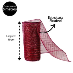 Com 15cm de largura e 5 metros de comprimento por rolo, esta tela pode ser utilizada para decorar árvores de Natal, moldar laços em guirlandas, arranjos de mesa, embalagens de presentes e enfeites variados. Sua estrutura flexível e maleável facilita o manuseio, permitindo criar formas criativas com praticidade.