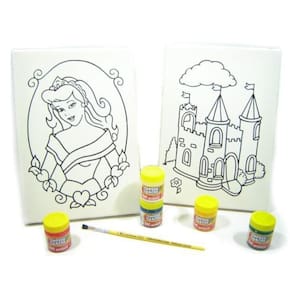 Composto por 2 telas para pintura, 1 pincel, 5 tintas guaches não-tóxica.
