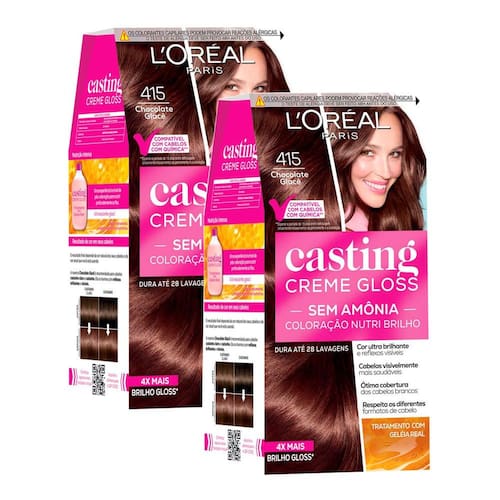 Casting Creme Gloss é a coloração sem amônia de L’Oréal Paris que garante 4X mais brilho e possui 17 nuances para você escolher a cor que mais combina com o seu cabelo, seja para dar brilho ou transformar! Tem excelente cobertura para os primeiros fios brancos e reflexos de cor visíveis, além de possuir um tratamento pós-coloração enriquecido com Geleia Real, para uma nutrição intensa dos fios. É a escolha perfeita para todos os tipos de cabelo: do curto ao longo, crespo, liso ou cacheado por conta da sua tecnologia sem amônia. Casting não prejudica a estrutura dos fios e ainda é compatível com cabelos quimicamente tratados. Durante a coloração, sua exclusiva fórmula reforça a fibra capilar, deixando seus fios mais macios e com toque aveludado. Principal componente: Coloração: sem amônia; Pós-coloração: tratamento com Geleia Real nutritiva. Benefícios: 1. Reflexos de cor visíveis; 2. Respeita o formato do seu cabelo; 3. Ótima cobertura dos primeiros fios brancos; 4. Dura até 28 lavagens; 5. Tratamento pós-coloração com Geleia Real; 6. Nutrição intensa, cabelos macios e sedosos; 7. 4X mais brilho gloss; 8. Tecnologia sem amônia; 9. Compatível com cabelos quimicamente tratados; Modo de Uso: Siga as instruções e precauções de uso no folheto contido no kit Benefícios: 1. Reflexos de cor visíveis; 2. Respeita o formato do seu cabelo; 3. Ótima cobertura dos primeiros fios brancos; 4. Dura até 28 lavagens; 5. Tratamento pós-coloração com Geleia Real; 6. Nutrição intensa, cabelos macios e sedosos; 7. 4X mais brilho gloss; 8. Tecnologia sem amônia; 9. Compatível com cabelos quimicamente tratados; Ingredientes: Acqua/water; cetearyl alcohol; deceth-3; propylene glycol; laureth-12; oleth-30; lauric acid; plyquaternium-6; glycol distearate; sodium metasilicate; silica dimetil silyate; p-aminophenol; carbomer; resorcinol fragance. Ean: 7896014183098