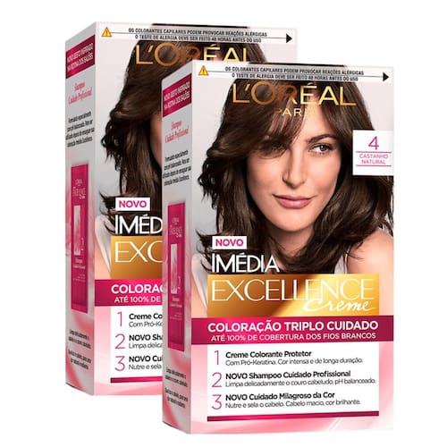 TINTURA CREME IMÉDIA EXCELLENCE L'ORÉAL CASTANHO NATURAL 4 Cor poderosa de longa duração; 100% de cobertura dos brancos; Cabelos 85% mais resistentes. Imédia Excellence Creme é a coloração permanente de L’Oréal Paris. Sua tecnologia avançada protege e cuida dos cabelos antes, durante e depois da coloração, com até 6 semanas de tratamento condicionador intenso. São 3 poderosos ativos reparadores: Pró-Keratina, que protege e fortalece os fios; Ceramida, que reforça a fibra capilar; e Ionene G, que restaura enquanto colore. O kit de Imédia Excellence contém: Sérum protetor pré-coloração: 12 ml; Creme colorante extra protetor com amônia: 47g; Revelador: 70 ml; Tratamento condicionador: 60 ml. Imédia Excellence possui o cuidado mais poderoso para um resultado de cor impecável e duradouro. A exclusiva tripla proteção conta com 3 ativos reparadores: Ceramida é um lipídio (gordura) presente naturalmente nos cabelos, entre as escamas. Sua função é reter água e nutrientes, mantendo a integridade dos fios e sendo responsável por reforçar a fibra capilar. A Pro-Keratina protege e fortalece os fios deixando-os macios e sedosos. Já o Ionene G é um polímero (molécula) que restaura os danos causados pelos compostos químicos contidos na coloração enquanto colore. Marca: Não Informado