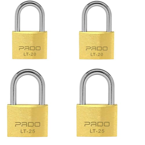 Descrição: Este Kit é composto por 2 unidades de cadeado Latão 20mm Pado e 2 unidades do cadeado Latão 25mm Pado Corpo em latão maciço com haste em aço