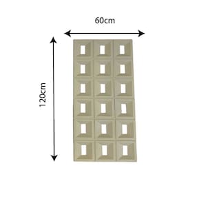 Ideal para paredes decorativas, painéis vazados e divisórias. Fixação recomendada com PU ou prego líquido (1 bisnaga a cada 4 peças). Cada placa tem 1 Face. Cor bege escuro. Acabamento: Com revelo Acompanha Cola: Não Acompanha Ficha Técnica: Não Acompanha Manual de Instalação: Não Ambiente Principal: Jardim e Varanda Ambientes Recomendados: Área Comercial/Área Residencial Área de Cobertura: 0,72 m² Auto adesivo: Não Comprimento: 120 cm Cor: Bege Escuro Cor do Produto: Bege Escuro Corte: Estilete Escala de Brilho: Acetinado Largura: 60 cm Local de Instalação: Áreas Externas Manual de Montagem e Instalação: https://product-hub-prd.madeiramadeira.com.br/774652562/documents/f6870a0f-90c0-49ac-ba93-a3d3712472823211801654517581177746676.pdf Marca: Formaco Decor Material Ecológico: Sim Material Principal: Poliuretano Necessita Pintura: Não Origem do Produto: Importado Peso por Caixa: 16,8 kgKg Peso Por Unidade: 2,8 kg Pode ser Pintado: Sim Tipo de Instalação: Colado Marca: Não Informado