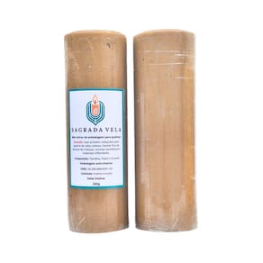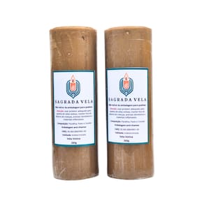 Contém 2 unidades. Cor: Dourada. Peso: 260 gramas. Altura: 15 cm. Diâmetro: 50 mm. Composição: Parafina, Corante e Pavio. Validade: Indeterminada. Marca: SAGRADA VELA.
