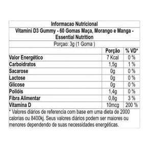 Kit 2 vitamini c essential nutrition 60 gomas A vitamina c está sempre presente nas etapas do desenvolvimento infantil. E sabe onde podemos encontrá-la Nas frutas como a laranja, o limão, a acerola e também nas gominhas vitamini c. A vitamina c auxilia no funcionamento do sistema imune, no metabolismo energético, na absorção de ferro dos alimentos e é um antioxidante que ajuda na proteção dos danos causados pelos radicais livres.Vitamini c gummy foi pensada especialmente para as crianças. São gominhas de morango, de manga e de maçã verde. E o melhor: todas sem açúcar, glúten, lactose, conservantes, corantes e aromas artificiais. Experimente essas gominhas vitaminadas e deliciosas A infância é uma fase de crescimento e desenvolvimento e um dos momentos mais importantes de nutrição. É essencial ter bons níveis de vitaminas para brincar, aprender e aproveitar a melhor fase da vida.A vantagem da alta absorção de vitamini c: investimos tempo, pesquisa e tecnologia para oferecer a vitamina c de forma mais eficiente para o corpinho dos pequenos. Vitamini c possui vitamina c revestida que é liberada somente no intestino, garantindo uma absorção superior. Ingredientes: sabor maçã verde: xarope de fibra de tapioca, gelatina, vitamina c revestida, agente de massa xarope de maltitol, edulcorantes xilitol e estévia, acidulante ácido cítrico, aroma natural de maçã verde, glaceante cera de carnaúba, corante natural clorofila. Não contém glúten. Sabor manga: xarope de fibra de tapioca, gelatina, vitamina c revestida, agente de massa xarope de maltitol, edulcorantes xilitol e estévia, acidulante ácido cítrico, aroma natural de manga, glaceante cera de carnaúba, corante natural betacaroteno. Não contém glúten. Sabor morango: xarope de fibra de tapioca, gelatina, vitamina c revestida, agente de massa xarope de maltitol, edulcorantes xilitol e estévia, acidulante ácido cítrico, aroma natural de morango, glaceante cera de carnaúba, corante natural antocianina. Não contém glúten. Sobre a marca: a essential nutrition é especializada no desenvolvimento de suplementos alimentares, funcionais e nutrição. Cada produto nosso é muito mais que um produto: é um desejo de algo grandioso para a sua vida. É um manifesto pelo desenvolvimento pessoal com mais qualidade de vida. É por isso que todos os ingredientes que estão, e também os que não estão em nossas fórmulas foram pensados, estudados e fazem parte dos nossos princípios de nutrição. Esse mesmo propósito é compartilhado com médicos e nutricionistas, além de esportistas e pessoas que buscam uma alimentação equilibrada, associada a um melhor estilo de vida. Essas pessoas nos motivam diariamente a continuar desenvolvendo produtos de alta qualidade e inspirando cada vez mais pessoas a viverem melhor. Curadoria: nossos produtos são criteriosamente validados pela nossa curadoria de produtos saudáveis, que busca produtores e empresas que compartilham do nosso alto padrão de qualidade. Da enorme lista de ingredientes banidos à preocupação do bem estar animal, desde o primeiro dia seguimos fieis aos nossos valores, trabalhando com transparência e práticas sustentáveis. Vendemos apenas produtos que admiramos e que nos orgulha.ANVISA: Registro ISENTO conforme resolução RDC 27 de 06 de agosto de 2010 anexo I.
