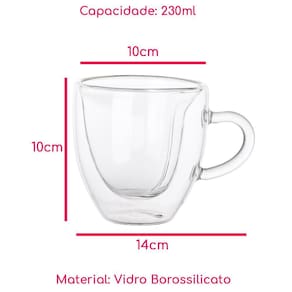 Características: Altura: 10cm Diâmetro: 10cm Comprimento com alça: 14cm Capacidade: 230ml Material: Vidro Borossilicato Marca: Class Home Conteúdo: 2 Xícaras