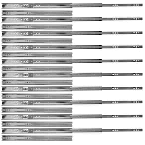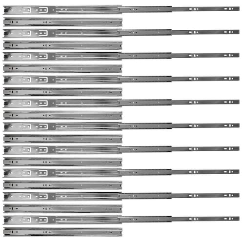 Kit com 20 Corrediças 10 pares Telescópica Trilho 450mm x 35mm 35Kg para Gaveta Rayco A Corrediça telescópica 45cm x 35mm da Rayco é indicada para gavetas de cozinhas, closets, quartos, banheiros, lavanderias, prateleiras retráteis/extensíveis, bases de teclado e mobiliário em geral. O par suporta até 35kg. - Marca: Rayco - Referência: R20532-10X - Acompanha 20 corrediças 10 Pares - Comprimento: 45cm 18 Polegadas - Largura: 35mm - Espessura: 12,1mm - Para uso geral e pesado - Possibilita a abertura total da gaveta com deslizamento suave, preciso e resistente - Corpo em aço galvanizado - Deslizamento através de de aço - Tipo: telescópica - O par suporta até 35kg - Peso: 590 gramas por par - : 90 dias