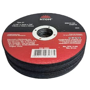 Kit com 20 Discos de Corte Fino 4 1/2 Pol. 115mm para Esmerilhadeira Inox Metal HTOMDisco de corte 115mm indicado para cortar inox e metal com esmerilhadeiras. Furo de 22mm e espessura de 1mm.- Marca: HTOM- Referência: HTOM-40563-20x- Kit com 20 Discos- Diâmetro: 4-12 115mm - Furo: 7/8 22m - Espessura: 1mm- Indicado para corte de metais em geral e aço inoxidável- Rotação máxima: 13.300 rpm- Composição: corundum branco- Garantia: 90 dias contra defeito de fabricação