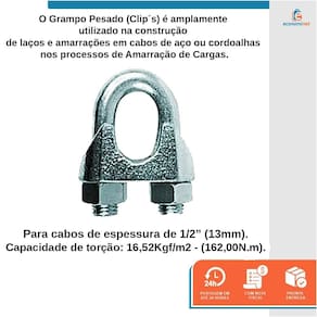 Grampo para cabo de aço pesado STARFER 1/2O Grampo Pesado (Clip´s) é amplamente utilizado na construção de laços e amarrações em cabos de aço ou cordoalhas nos processos de Amarração de Cargas.Para a correta utilização do Grampo Pesado as normas de montagem dos grampos e construção dos laços devem ser rigorosamente seguidas.Grampo com corpo fundido em aço carbono galvanizado, alças e porcas em aço 1020 de acordo com a norma DIN 741.Não deve ser utilizado em aplicações de movimentação de cargas.• Material: Aço Carbono Galvanizado• Tamanho 1/2" (13mm).• Capacidade de torção: 16,52kgf/m2 (162,00N.m).Embalagem: Saco plástico com 20 peças.Ref. 07015054Marca: Starfer*IMAGENS MERAMENTE ILUSTRATIVAS*