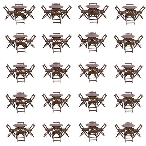 Kit 20 Jogos De Mesa Dobravel Com 4 Cadeiras Tampo Redondo 70x70 Imbuia O Jogo De Mesa Bar Tampo Redondo 70x70 Com 4 Cadeiras Dobrável é um produto onde toda sua estrutura é Madeira maciça menos o tampo da Mesa que não é madeira e sim MDF , garantindo assim o melhor custo beneficio, sem deixar a qualidade de lado.O produto é ideal para bares e restaurantes, festas, clubes, boates e lógico pode deixar a sua casa ainda mais bonita, por ser dobrável, permite que seja facilmente removido para limpeza do local, economizando tempo e esforço.Composto por 1 Mesa Dobrável com Tampo Redondo 70x70 e 4 CadeirasTamanho e Peso aproximados:MesaAltura: 75 CmLargura: 70 CmComprimento: 70 Cm10 KgEspessura do Tampo: 15mmCadeira AbertaAssento: 45 cmEncosto : 75 cmLargura: 39 cmPeso Recomendado: 120 Kg
