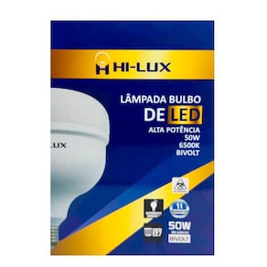 ESPECIFICAÇÕES - Índice de proteção: IP20 - Tensão: Bivolt Automático 100V - 240V - Ângulo de abertura: 220º - IRC**: >80 - Vida útil: 25.000 horas - Potência: 50W - Fluxo luminoso: 4000 lumens - Base: E27 - Temperatura de cor: 6500K (Branca) - Eficiência luminosa: 80lm/W -Dimensão (mm): 138mm x 190mm