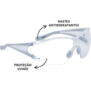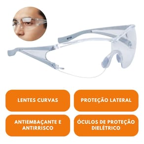 Óculos de proteção monobloco com amplo campo de proteção e proteções laterais, compatibilidade com protetores auriculares.